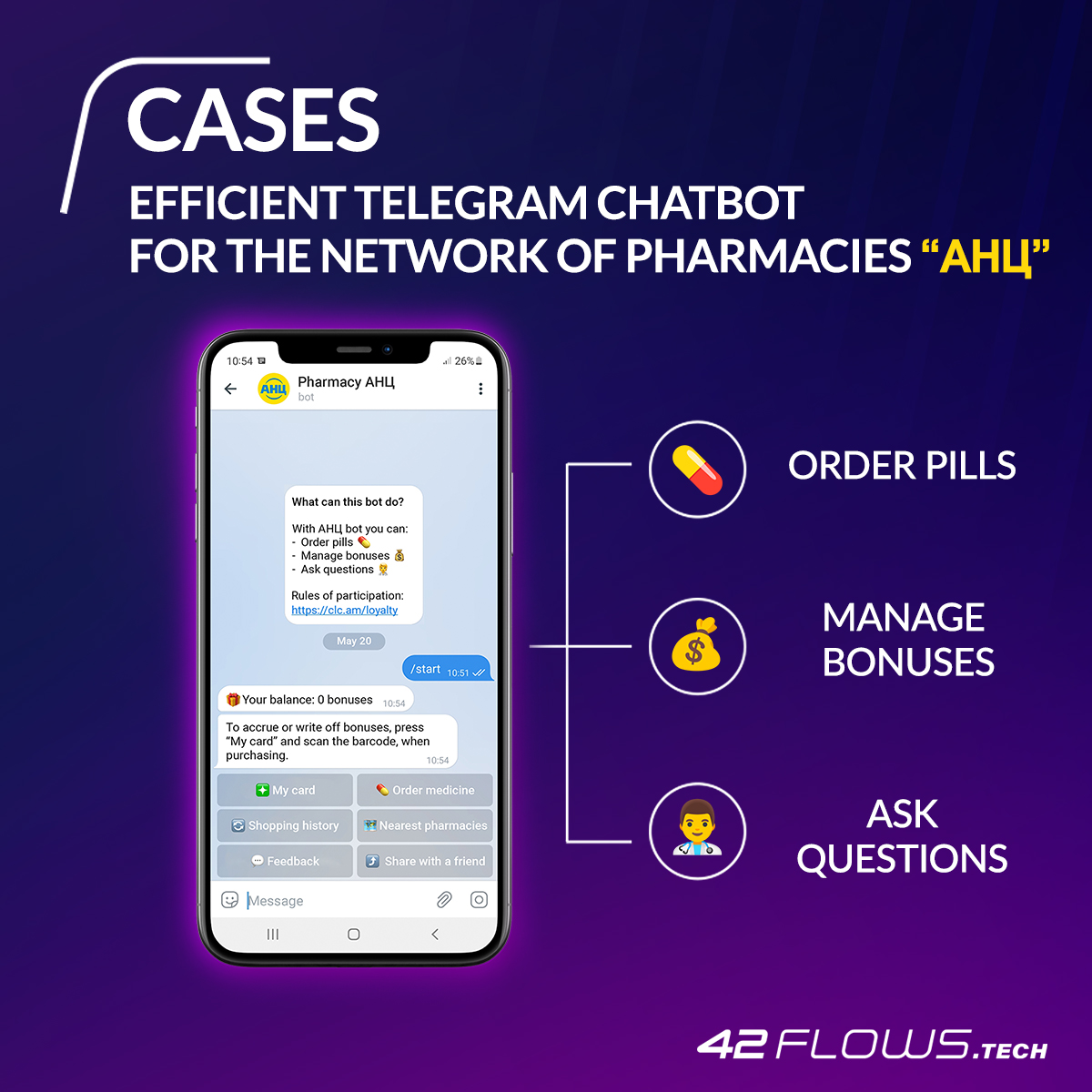 In addition, with the beginning of the Covid-19 pandemics, the workload on pharmacies has increased many times, so naturally, there was a problem with assistance to pharmacy staff. In such conditions, the digitalization of pharmaceutical services has become the basis of security of the pharmaceutical industry and helped to optimize their work. Our task was to create a chatbot that would help the АНЦ to optimize the work of the pharmacy network and make it more efficient.