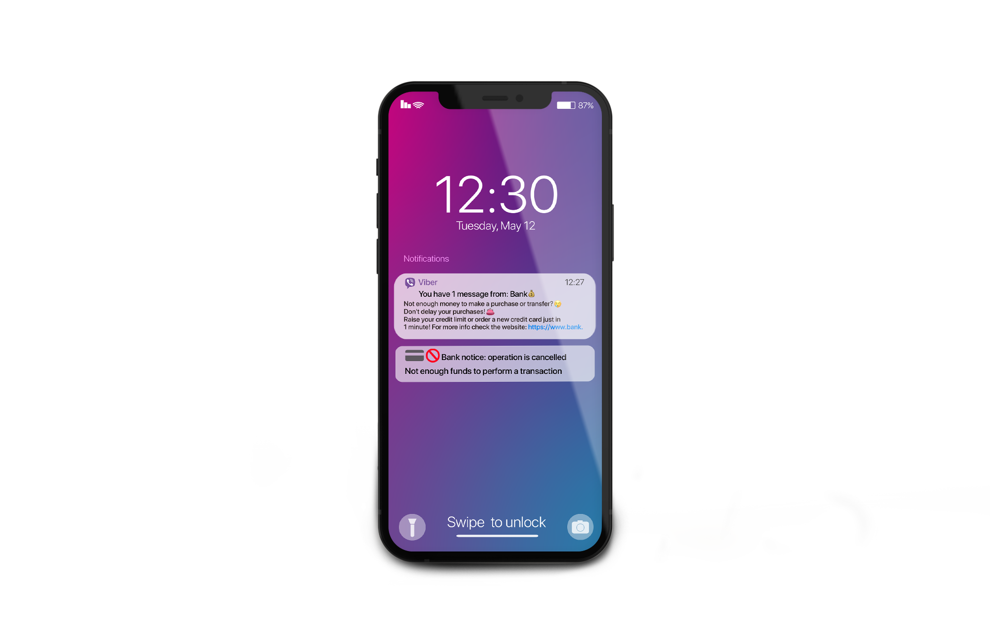 The message on Viber and in the app from our customer bank on the phone that proposes to use the credit card from the bank when the customer does not have enough money on own account